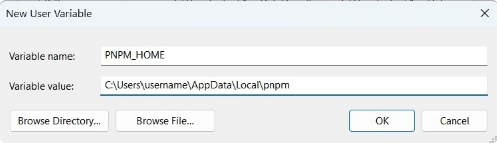 * Pada "Nama Variabel", ketik PNPM_HOME. Dan pada "Nilai Variabel", ketik jalur C:\Users\nama pengguna\AppData\Local\pnpm. Ubah nama pengguna menjadi nama pengguna komputer Anda.