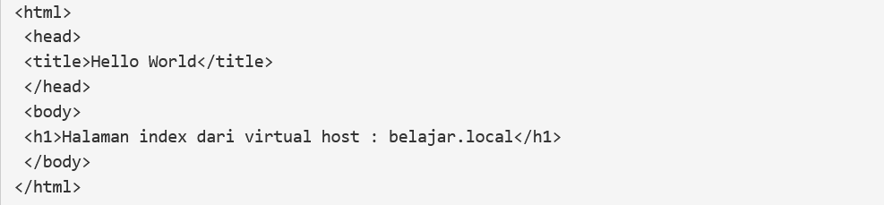 Semua kebutuhan atau konfirgurasi untuk membuat virtual host telah selesai. Silakan buka web browser Anda dan ketikkan alamat : http://www.belajar.local. Maka akan muncul file html yang telah dibuat tadi.