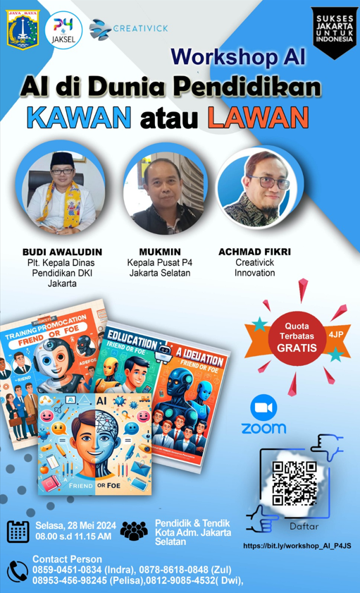 Bapak/Ibu yang kami hormati, izinkan kami Panitia Pelatihan Pengembangan Kompetensi Pendidik dan Tenaga Kependidikan P4 Jakarta Selatan menyampaikan informasi Kegiatan Workshop AI secara Daring yang dilaksanakan P4 Jakarta Selatan.